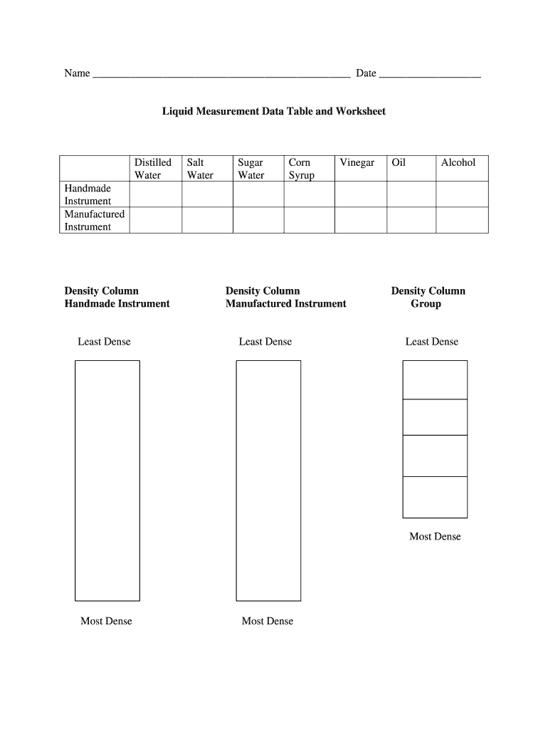 Name Date Liquid Measurement Data Table and Worksheet Distilled Water Salt Water Sugar Water Corn Syrup Vinegar Oil Alcohol Handmade Instrument Manufactured Instrument Density Column Handmade Instrument