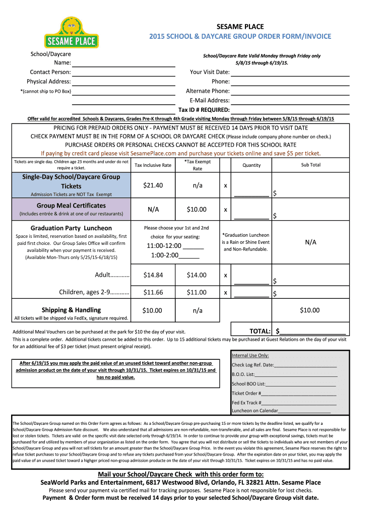 SESAME PLACE 2015 SCHOOL & DAYCARE GROUP ORDER FORM×INVOICE School×Daycare Name: Contact Person: Physical Address: School×Daycare Rate Valid Monday through Friday only 5×8/15 through 6×19/15.