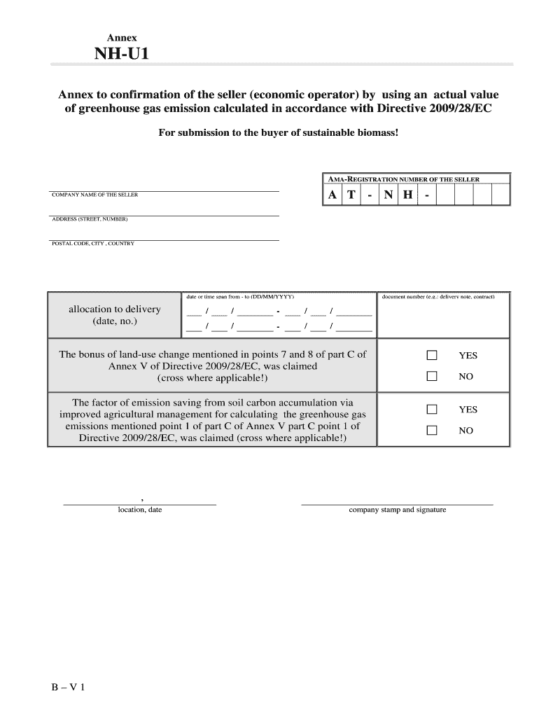 B V 1 Annex NHU1 Annex to confirmation of the seller (economic operator) by using an actual value of greenhouse gas emission calculated in accordance with ...