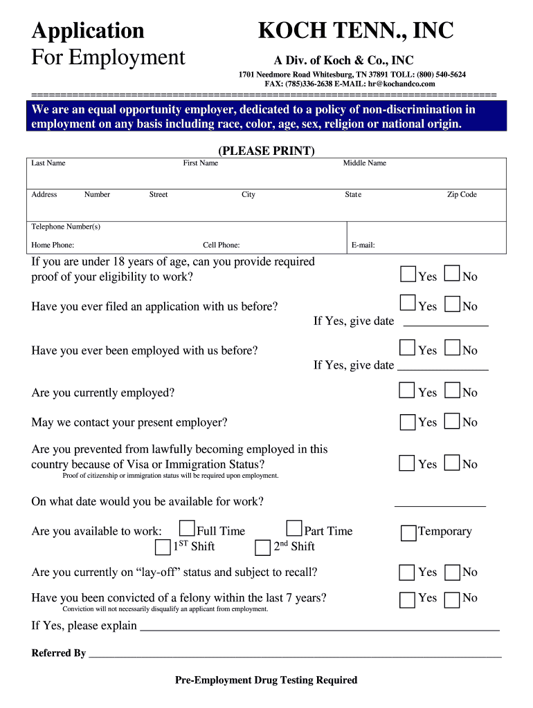 Application For Employment KOCH TENN., INC A Div. Of Koch & Co., INC 1701 Need more Road Whites burg, TN 37891 TOLL: (800× 5405624 FAX: (785×3362638 EMAIL: hr kochandco.com We are an equal opportunity