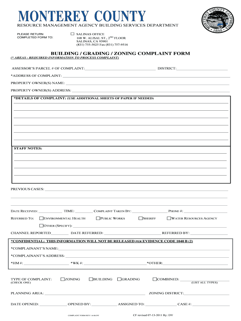 Get the free BUILDING / GRADING / ZONING COMPLAINT FORM - co monterey ca