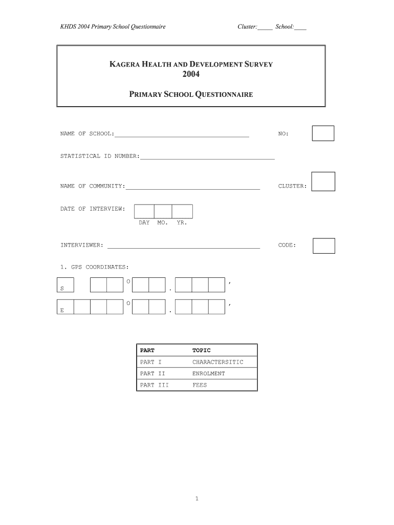 KIDS 2004 Primary School Questionnaire Cluster: School: CAMERA HEALTH AND DEVELOPMENT SURVEY 2004 PRIMARY SCHOOL QUESTIONNAIRE NAME OF SCHOOL: NO: STATISTICAL ID NUMBER: NAME OF COMMUNITY: CLUSTER: