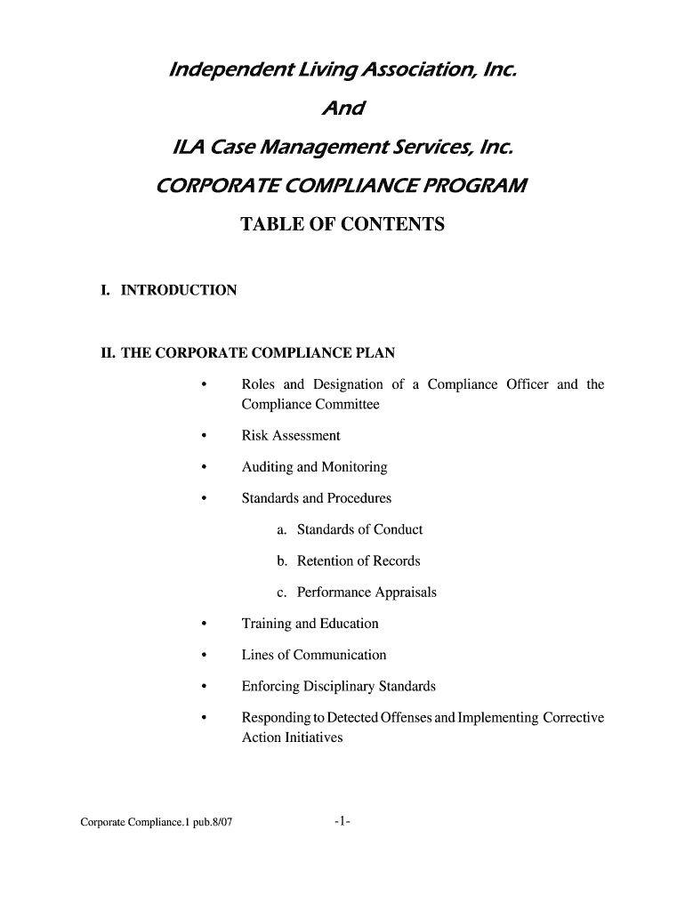 Independent Living Association, Inc. And ILA Case Management Services, Inc. CORPORATE COMPLIANCE PROGRAM TABLE OF CONTENTS I. INTRODUCTION II. THE CORPORATE COMPLIANCE PLAN Roles and Designation of