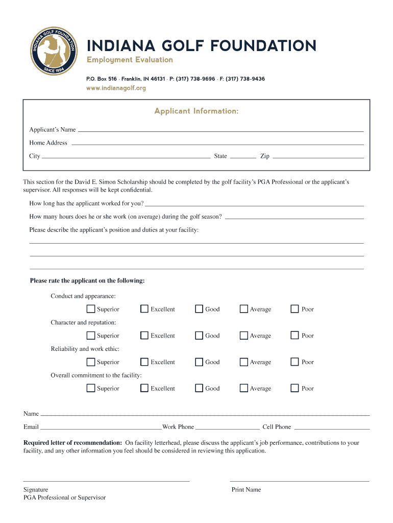 INDIANA GOLF FOUNDATION Employment Evaluation P.O. Box 516 Franklin, IN 46131 P: (317× 7389696 F: (317× 7389436 www.indianagolf.org Applicant Information: Applicants Name Home Address City State