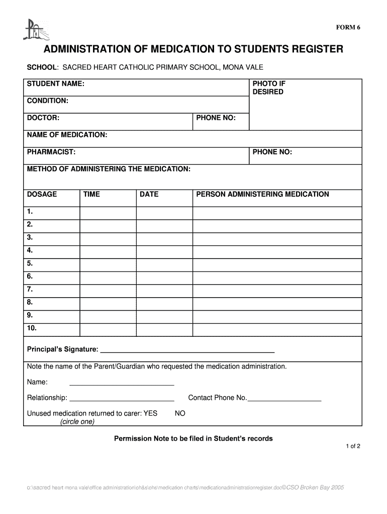 FORM 6 ADMINISTRATION OF MEDICATION TO STUDENTS REGISTER SCHOOL: SACRED HEART CATHOLIC PRIMARY SCHOOL, MONA VALE STUDENT NAME: PHOTO IF DESIRED CONDITION: DOCTOR: PHONE NO: NAME OF MEDICATION: PHARMACIST: