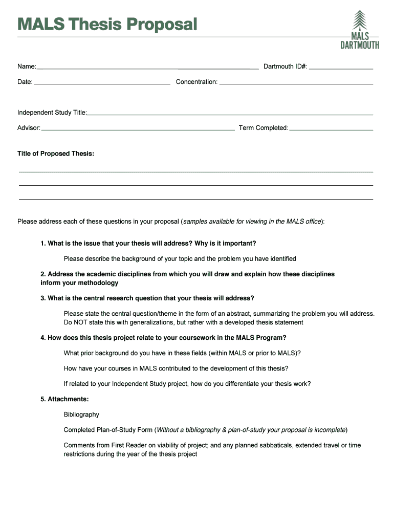 Name: Dartmouth ID#: Date: Concentration: Independent Study Title: Advisor: Term Completed: Title of Proposed Thesis: Please address each of these questions in your proposal (samples available for
