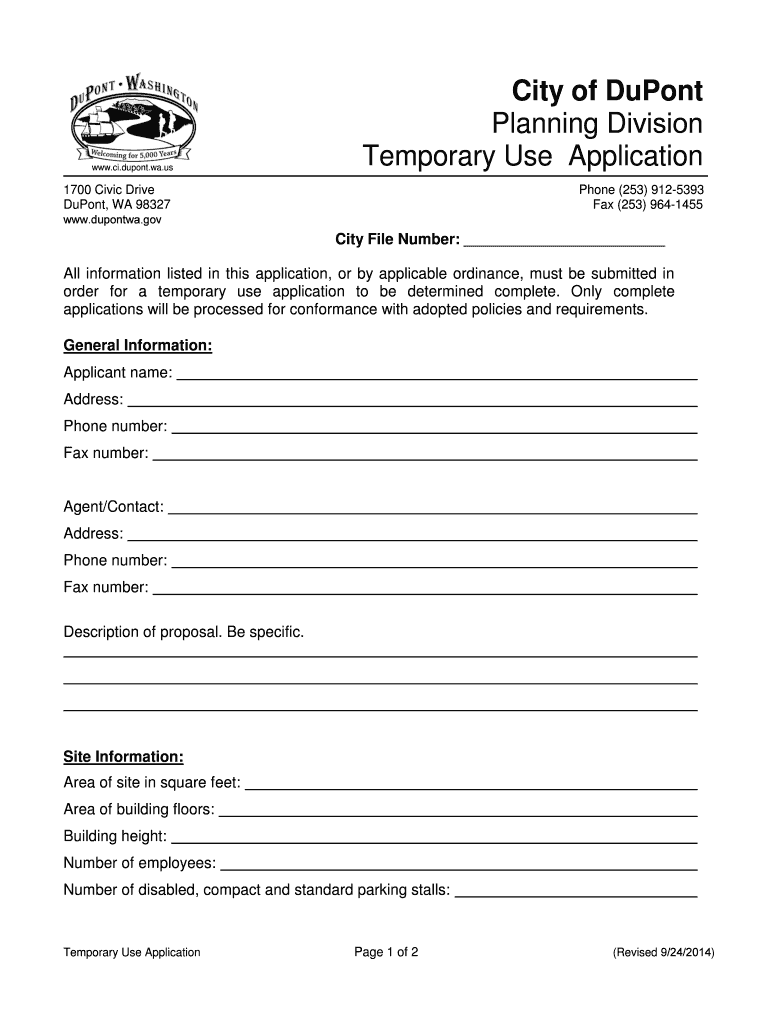 WWW.CI. DuPont. Wei.us City of DuPont Planning Division Temporary Use Application 1700 Civic Drive DuPont, WA 98327 Phone (253× 9125393 Fax (253× 9641455 www.dupontwa.gov City File Number: All information
