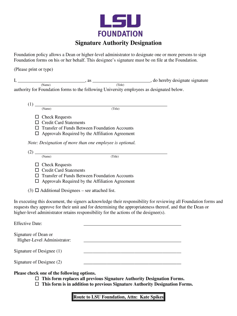 Get the free Signature Authority Designation - LSU Foundation - lsufoundation