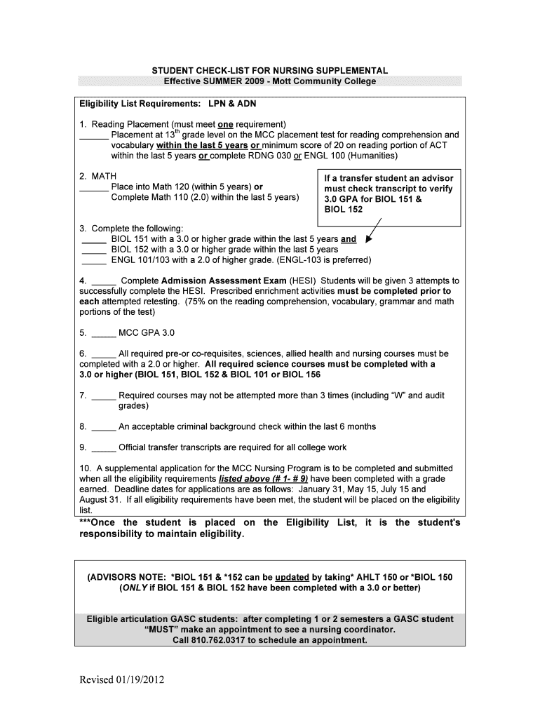 All nursing students who are enrolled in a program that requires supplemental documentation or information to be submitted must file the Student Check-List for Nursing Supplemental.