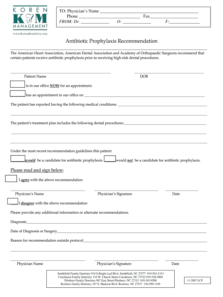 TO: Physicians Name Phone Fax FROM: Dr. O: F: Antibiotic Prophylaxis Recommendation The American Heart Association, American Dental Association and Academy of Orthopedic Surgeons recommend that certain