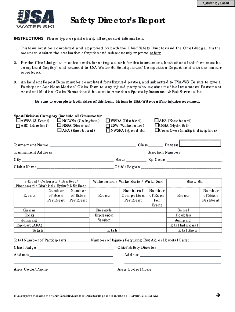 Get the free Safety Director’s Report - usawaterski