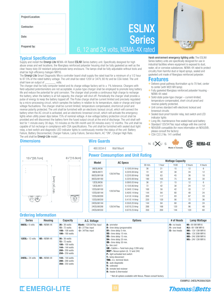 Project×Location: ESPN Series Contractor: Date: Prepared by: 6, 12 and 24 volts, NEMA4X rated Typical Specification Supply and install the Em ergo Lite NEMA4X Rated ESL NO Series battery unit. Specifically