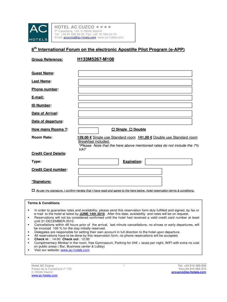 The Hotel Reservation Form is a service agreement used by guests to book accommodations at Hotel AC Cuzco in Madrid, Spain.