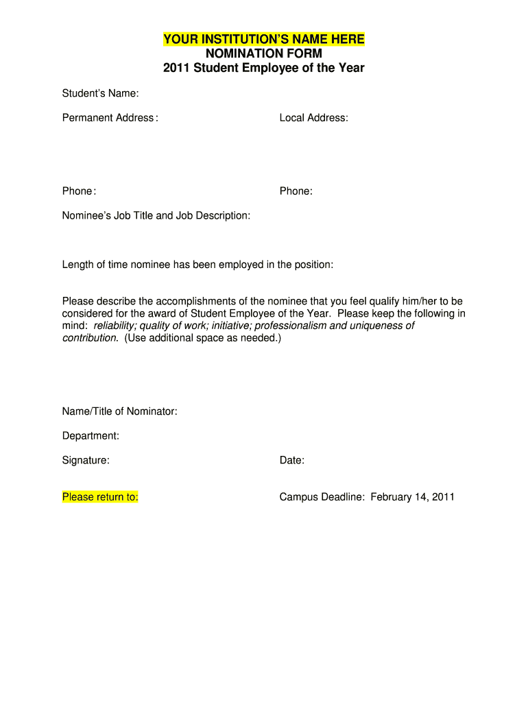 This document serves as a nomination form for the Student Employee of the Year award, intended to capture the nominee's details, accomplishments, and the nominator's information.