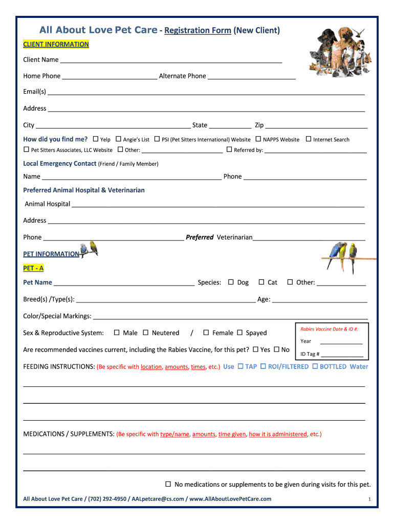 All About Love Pet Care Registration Form (New Client) CLIENT INFORMATION Client Name Home Phone Alternate Phone Email’s) Address City State Zip How did you find me? Yelp Angie's List PSI (Pet Sitters