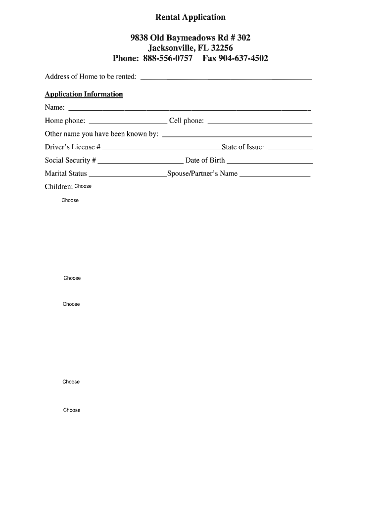 Rental Application 9838 Old Bay meadows Rd # 302 Jacksonville, FL 32256 Phone: 8885560757 Fax 9046374502 Address of Home to be rented: Application Information Name: Home phone: Cell phone: Other name