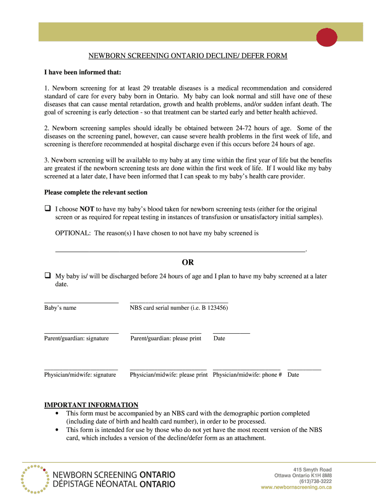 Get the free NEWBORN SCREENING ONTARIO DECLINE DEFER FORM - newbornscreening on
