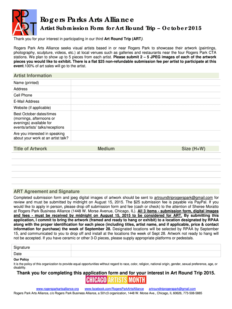 Rogers Parks Arts Alliance Art Round Trip Details October 2015 Rogers Park Arts Alliance (RPA) in conjunction with Chicago Artists Month is delighted to present the 3rd installment of Art Round Trip