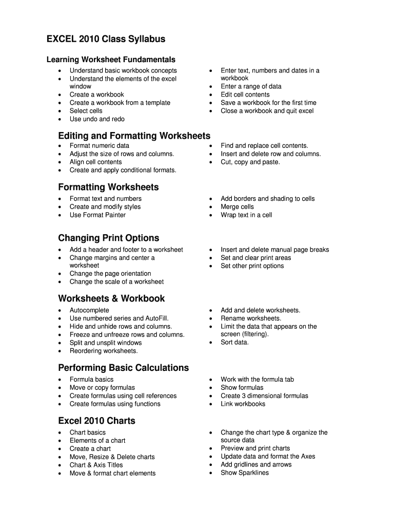 EXCEL 2010 Class Syllabus Learning Worksheet Fundamentals Understand basic workbook concepts Understand the elements of the Excel window Create a workbook Create a workbook from a template Select