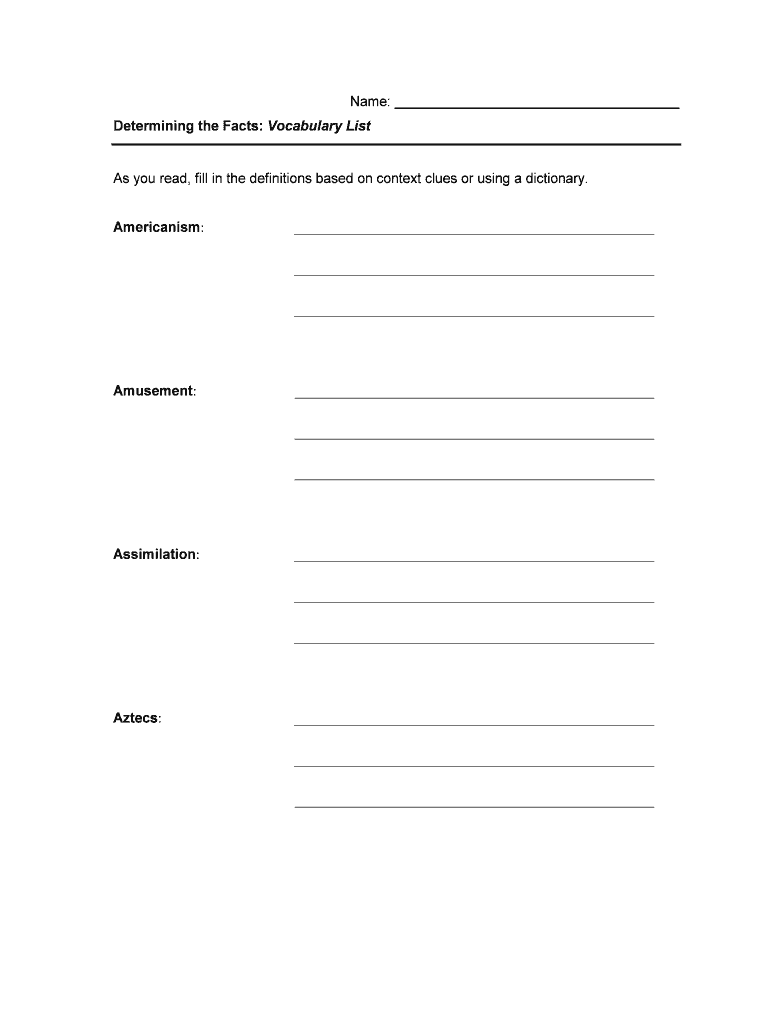 Name: Determining the Facts: Vocabulary List As you read, fill in the definitions based on context clues or using a dictionary.