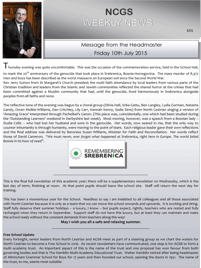 Get the free NCGS WEEKLY NEWS 655 Message from the Headmaster Friday 10th July 2015 T hursday eve...