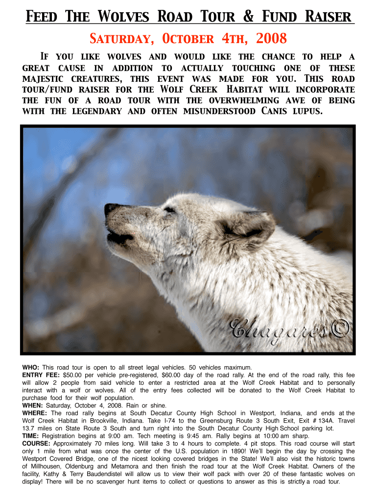 Feed The Wolves Road Tour & Fund Raiser Saturday, October 4th, 2008 If you like wolves and would like the chance to help a great cause in addition to actually touching one of these majestic creatures,