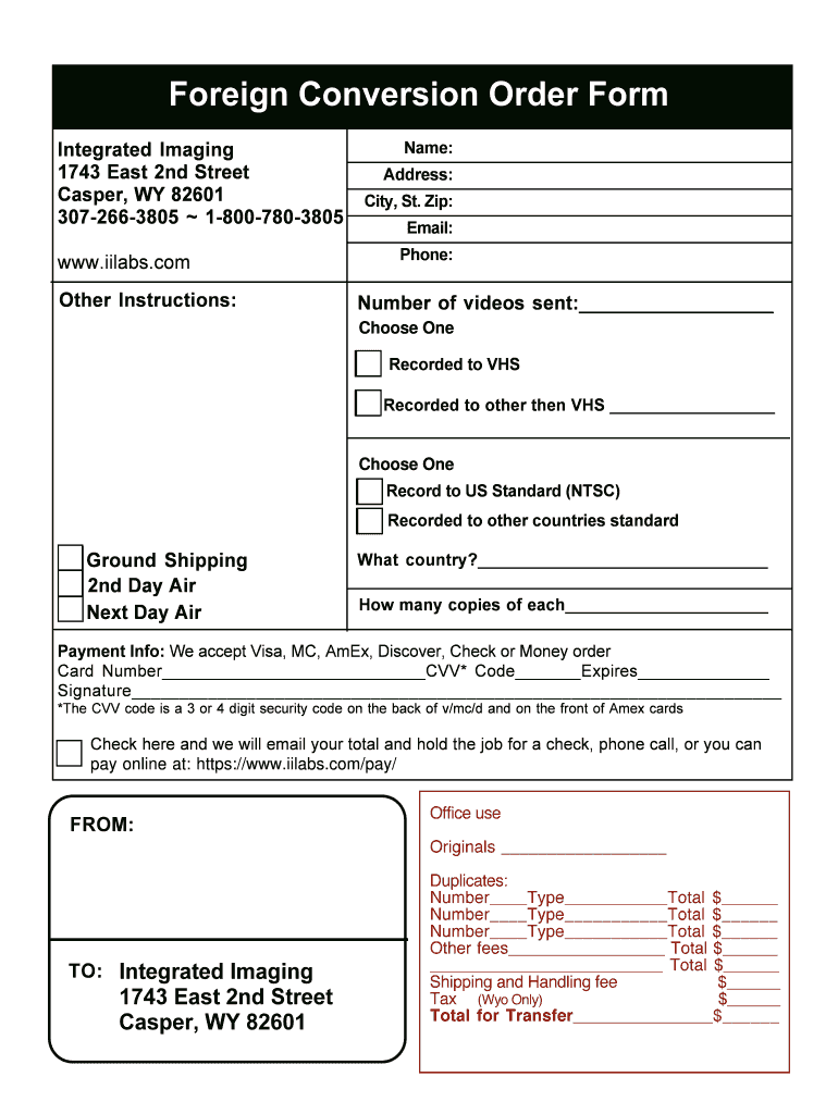 Foreign Conversion Order Form Integrated Imaging 1743 East 2nd Street Casper, WY 82601 3072663805 18007803805 www.iilabs.com Other Instructions: Name: Address: City, St. Zip: Email: Phone: Number
