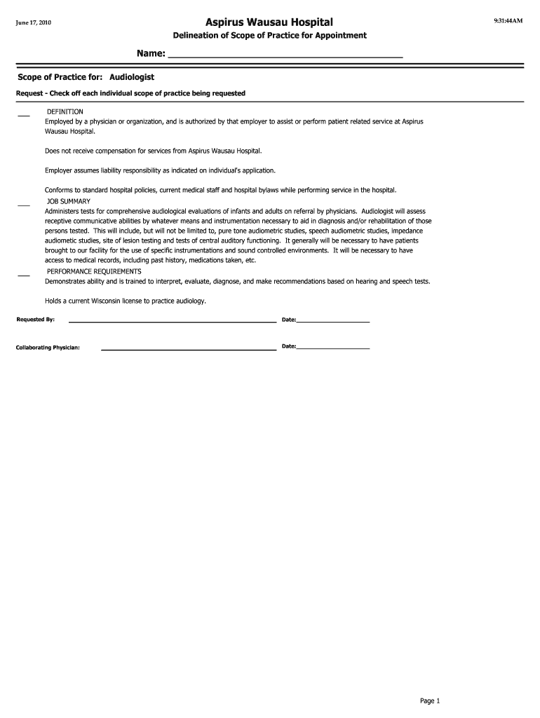 Aspires Wausau Hospital June 17, 2010 9:31:44AM Delineation of Scope of Practice for Appointment Name: Scope of Practice for: Audiologist Request Check off each individual scope of practice being