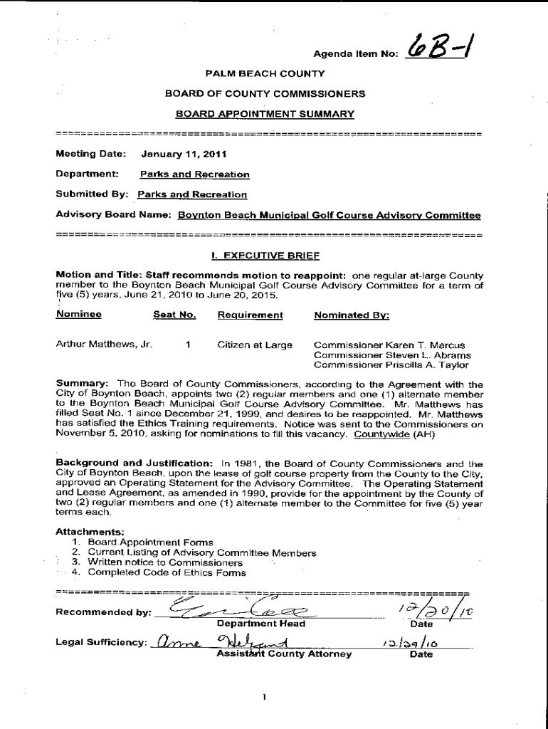 Agenda Item No:8/PALM BEACH COUNTY BOARD OF COUNTY COMMISSIONERS BOARD APPOINTMENT SUMMARY Meeting Date:January 11, 2011Department:Parks and RecreationSubmitted By: Parks and Recreation Advisory Board