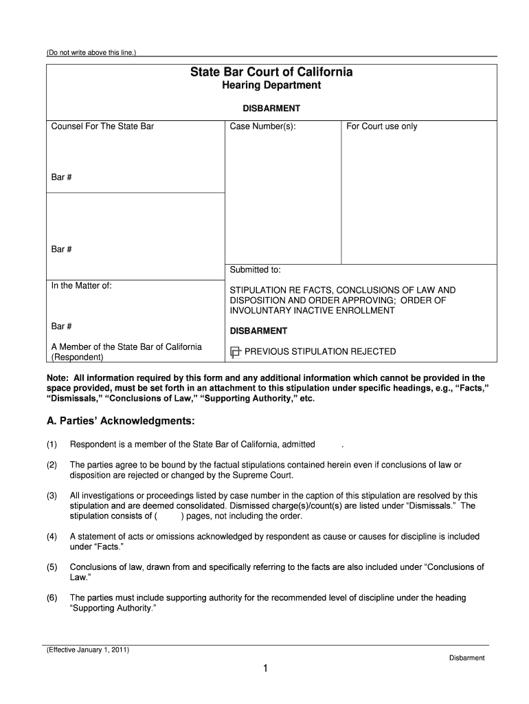 (Do not write above this line.) State Bar Court of California Hearing Department DISBARMENT Counsel For The State Bar Case Number’s): For Court use only Bar # Bar # Submitted to: In the Matter of: