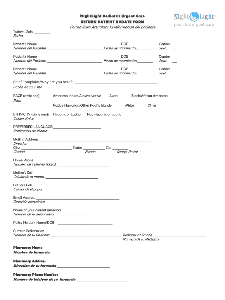 Nightlight Pediatric Urgent Care. RETURN PATIENT UPDATE FORM. Form Para Actualized la Information Del patients. Today#039’s Date Tech: Patients#039’s Name DOB ...