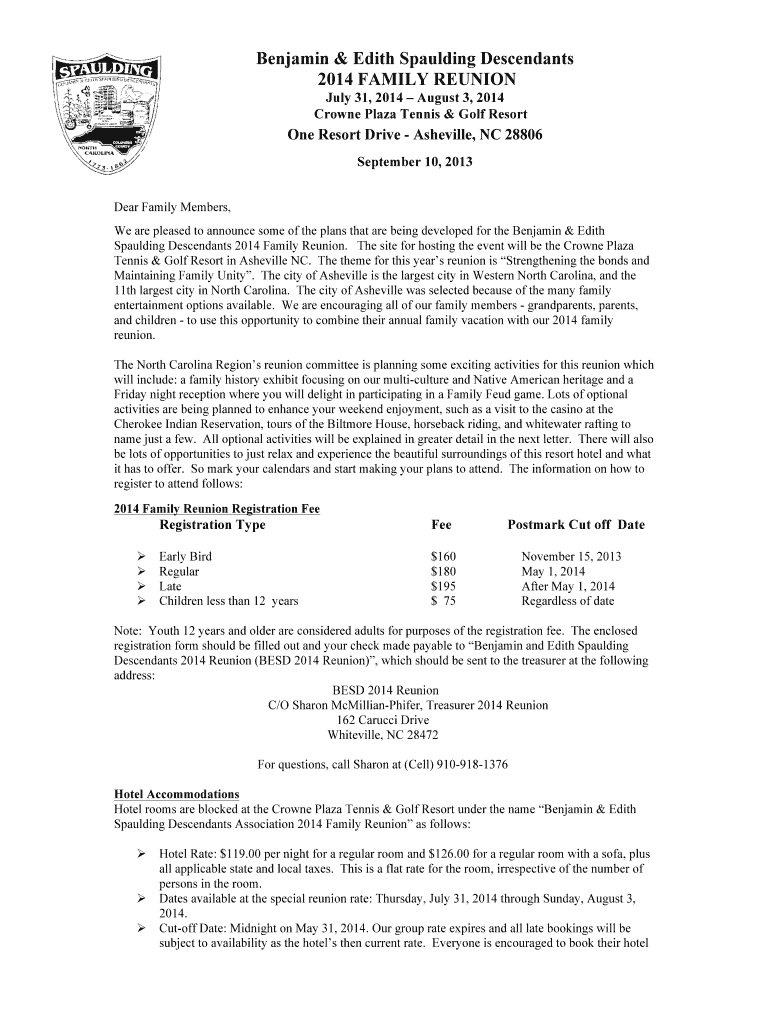 Benjamin & Edith Spaulding Descendants 2014 FAMILY REUNION July 31, 2014, August 3, 2014, Crown Plaza Tennis & Golf Resort One Resort Drive Asheville, NC 28806 September 10, 2013, Dear Family Members,