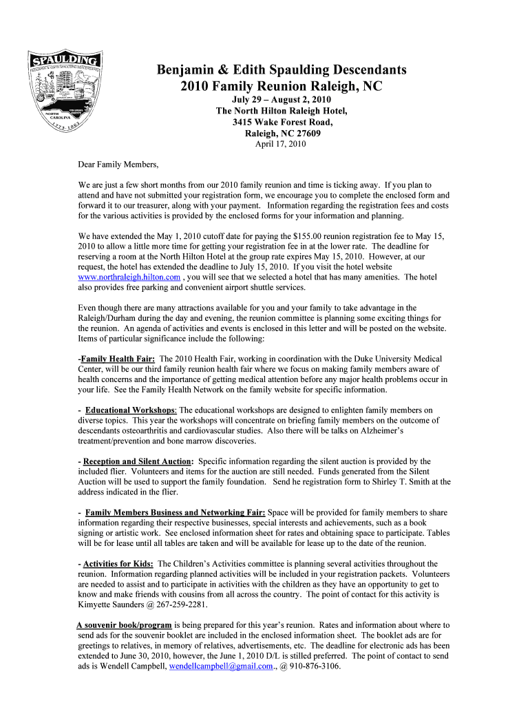 Benjamin & Edith Spaulding Descendants 2010 Family Reunion Raleigh, NC July 29 August 2, 2010, The North Hilton Raleigh Hotel, 3415 Wake Forest Road, Raleigh, NC 27609 April 17, 2010, Dear Family