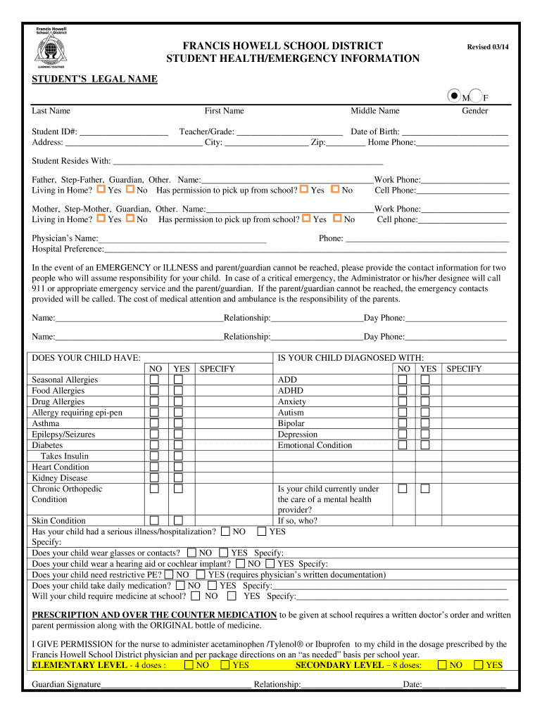 FRANCIS HOWELL SCHOOL DISTRICT STUDENT HEALTH×EMERGENCY INFORMATION Revised 03×14 STUDENTS LEGAL NAME Last Name First Name Middle Name M F Gender Student ID#: Teacher×Grade: Date of Birth: Address: