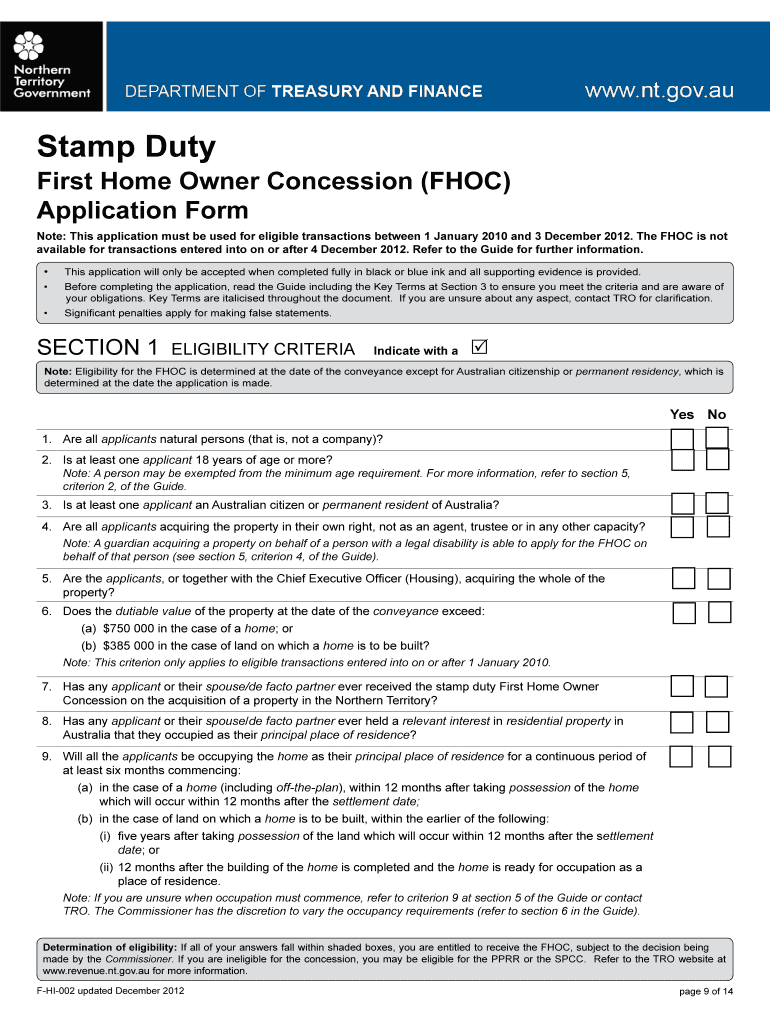 This guide explains the eligibility criteria, application procedures, and supporting evidence required for the First Home Owner Concession (FHOC) in the Northern Territory, Australia, including the