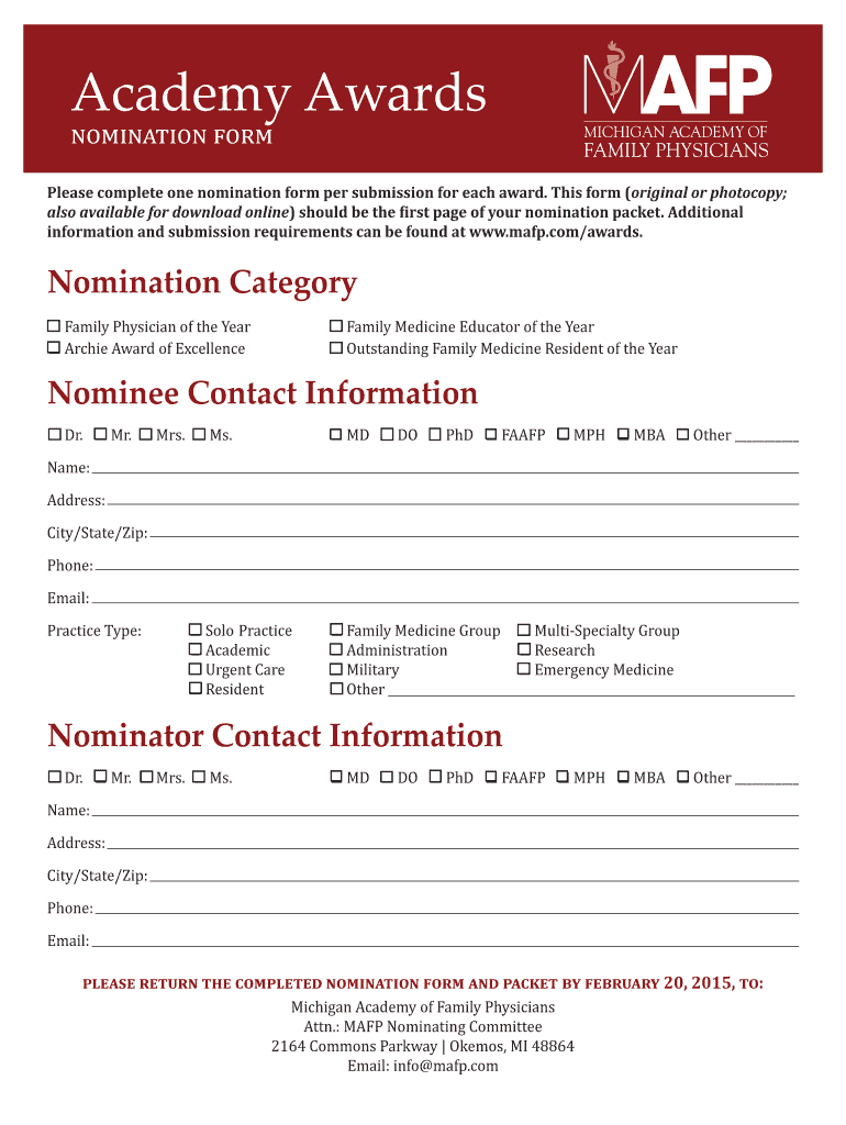 The nomination form - mafp can also be needed by individuals recommending someone for an award or recognition. They may be asked to provide their contact details and reasons for the nomination.