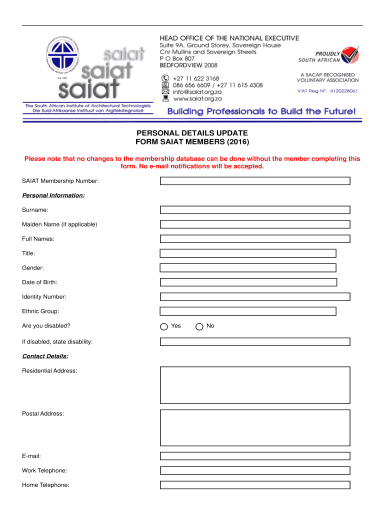 Get the free PERSONAL DETAILS UPDATE FORM SAIAT MEMBERS 2016 - saiat org