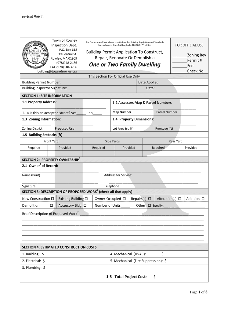 This document is an application form for obtaining a building permit for the construction, repair, renovation, or demolition of one or two family dwellings in the Town of Rowley, Massachusetts. It