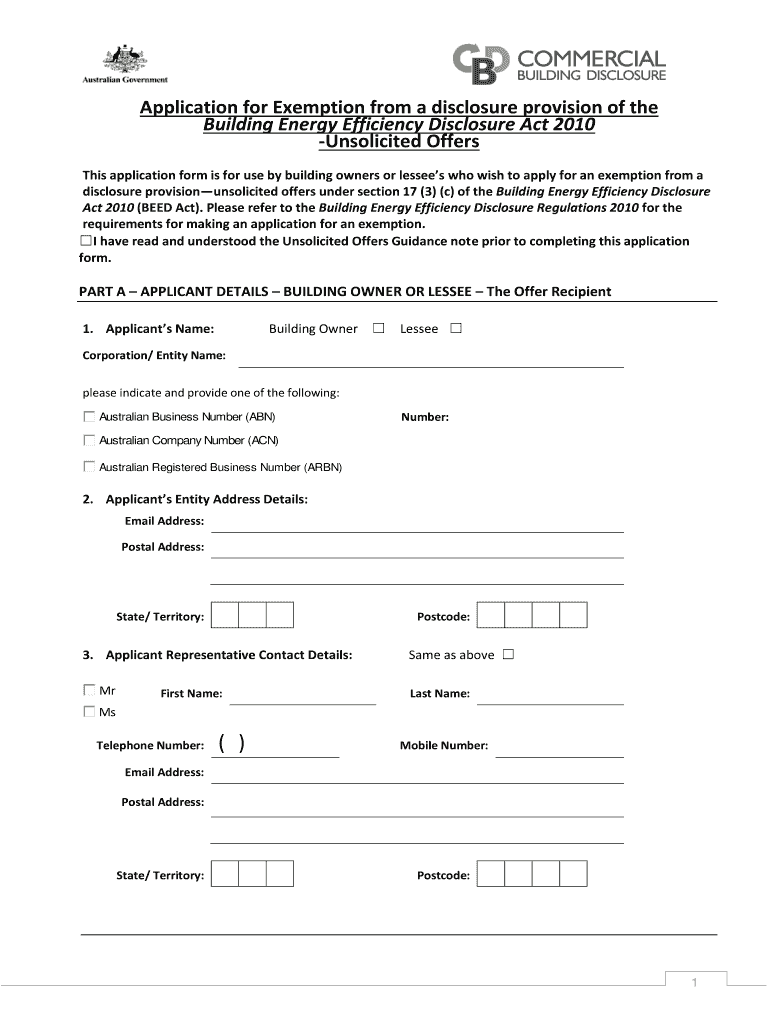 E Application for Exemption from a disclosure provision of the Building Energy Efficiency Disclosure Act 2010 Unsolicited Offers This application form is for use by building owners or lessees who