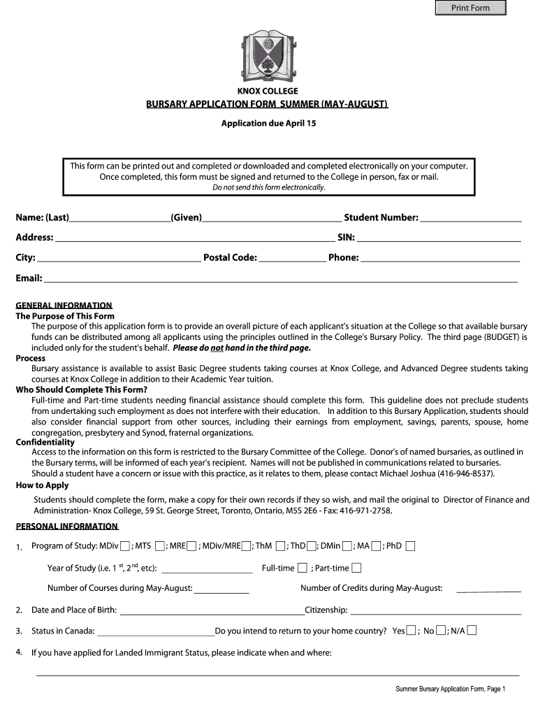 Print Form KNOX COLLEGE BURSARY APPLICATION FORM SUMMER (AUGUST) Application due April 15 This form can be printed out and completed or downloaded and completed electronically on your computer. Once