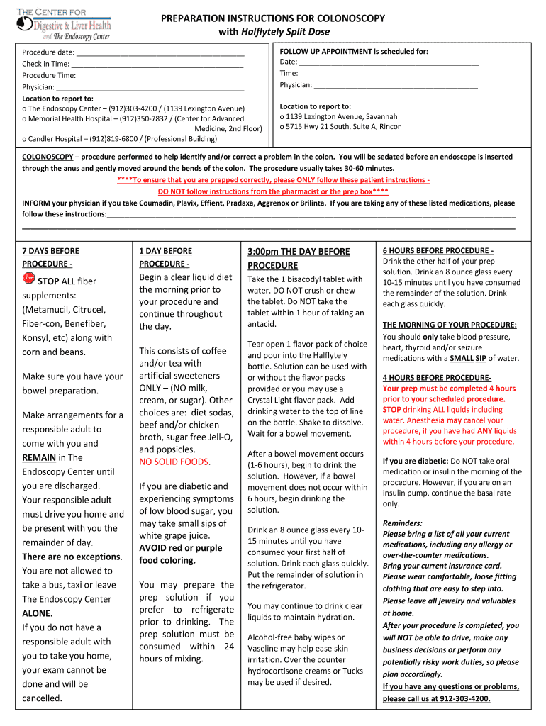 PREPARATION INSTRUCTIONS FOR COLONOSCOPY with Halflytely Split Dose Procedure date: Check in Time: Procedure Time: Physician: Location to report to: o The Endoscopy Center (912×3034200 / (1139 Lexington
