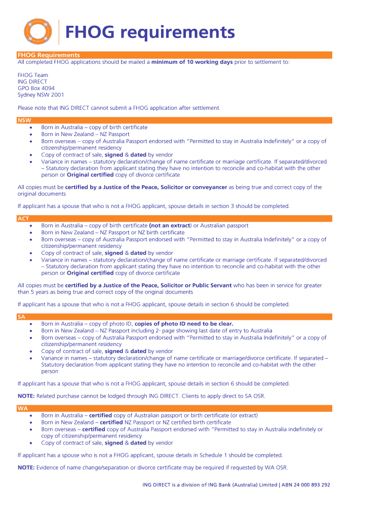This document outlines the requirements for submitting applications for the First Home Owner Grant (FHOG) across various states and territories in Australia, detailing the necessary documentation