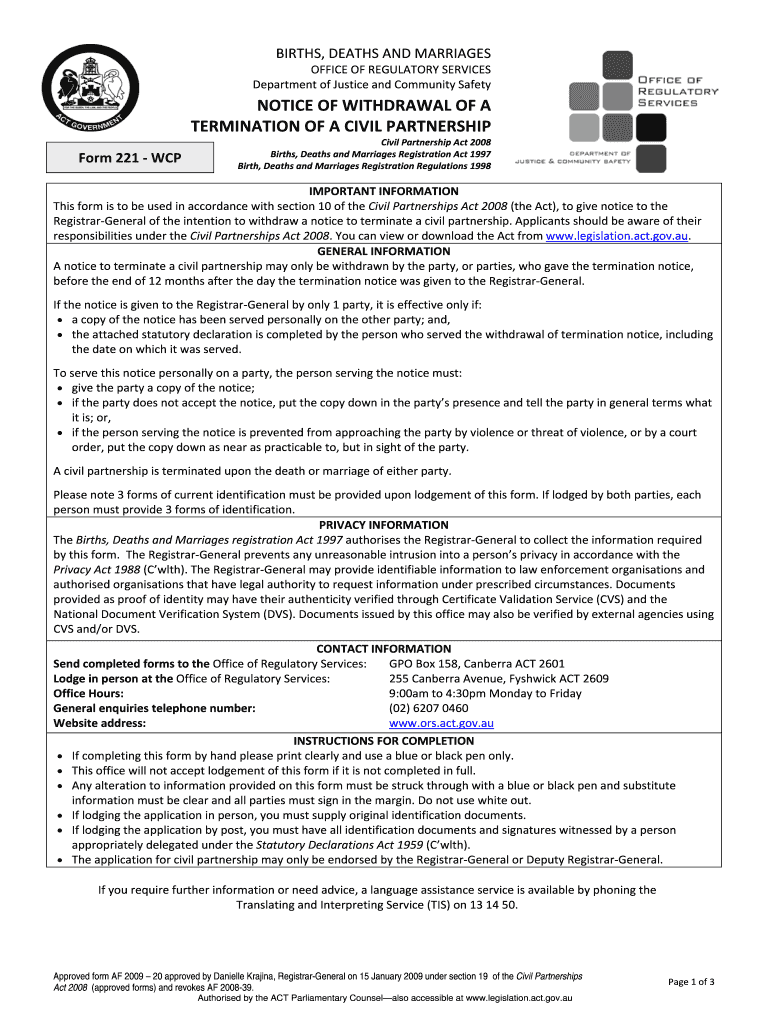 This form is used to notify the Registrar-General of the intention to withdraw a notice to terminate a civil partnership in accordance with the Civil Partnerships Act 2008.