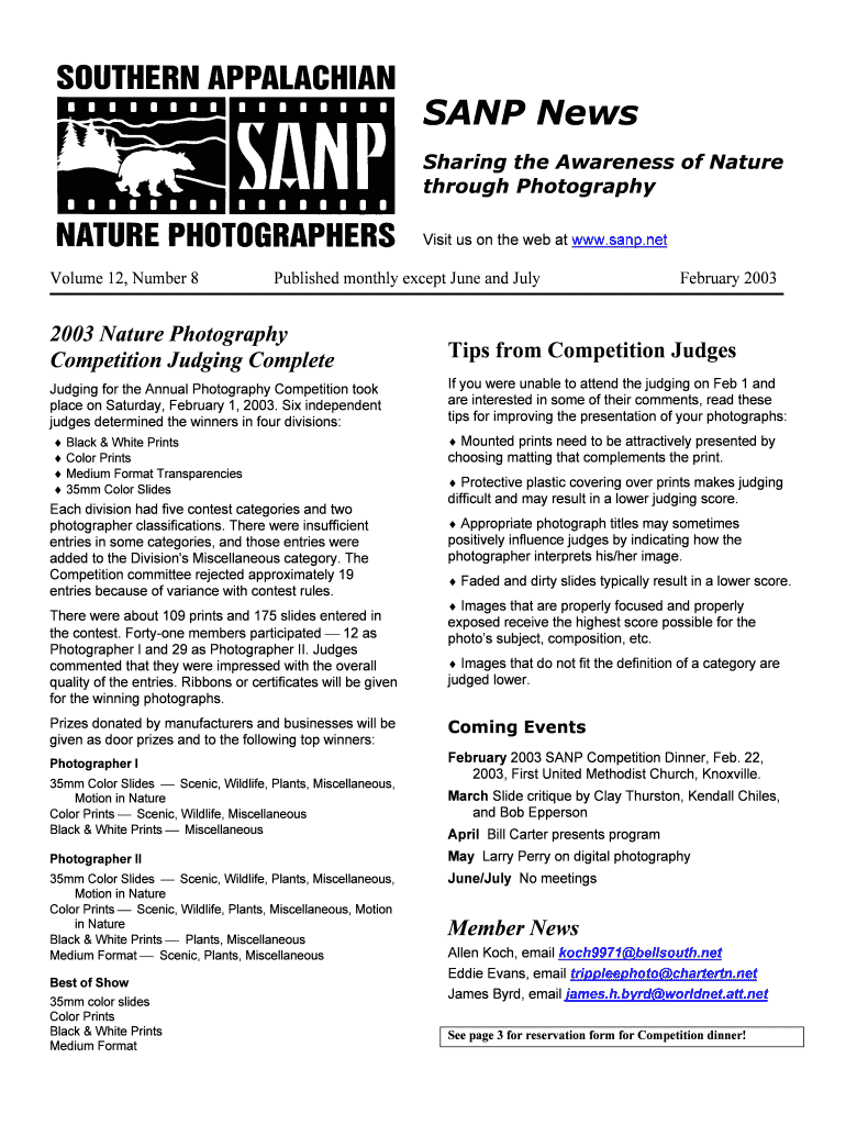 SAN News Sharing the Awareness of Nature through Photography Visit us on the web at www.sanp.net Volume 12, Number 8 Published monthly except June and July February 2003 2003 Nature Photography Competition