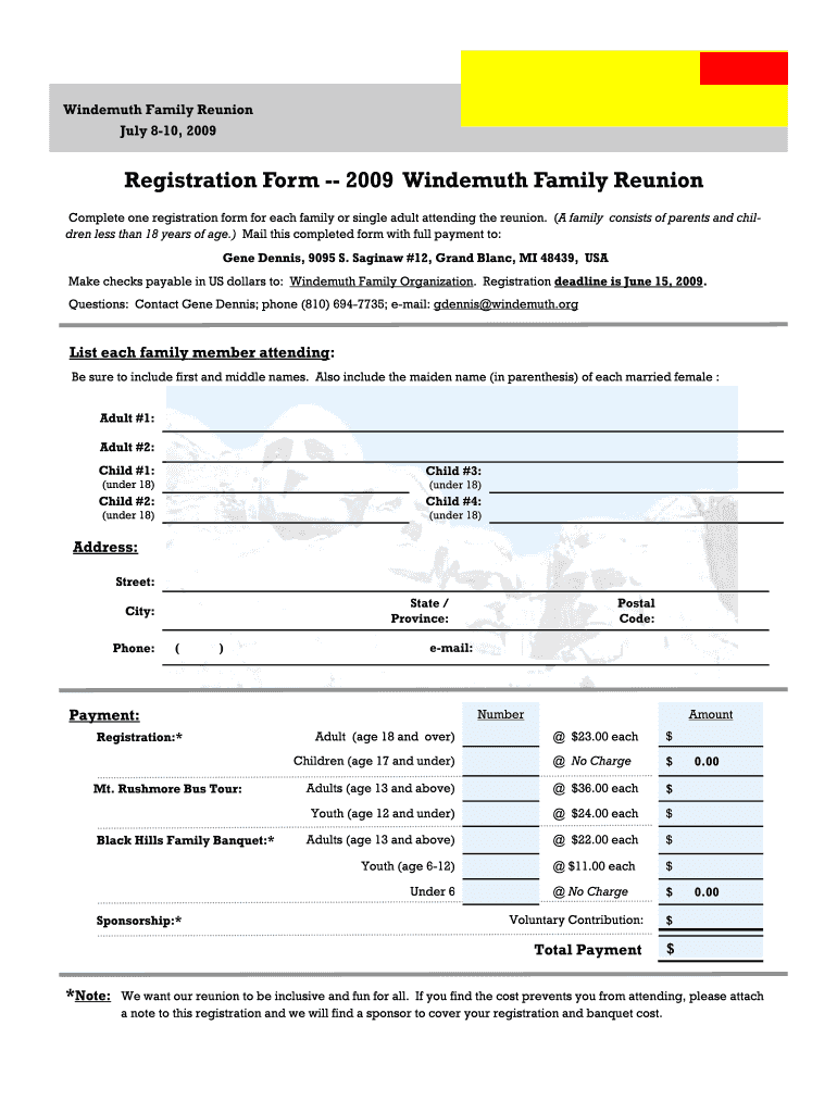 Get the free Registration Form -- 2009 bWindemuthb Family Reunion - windemuth