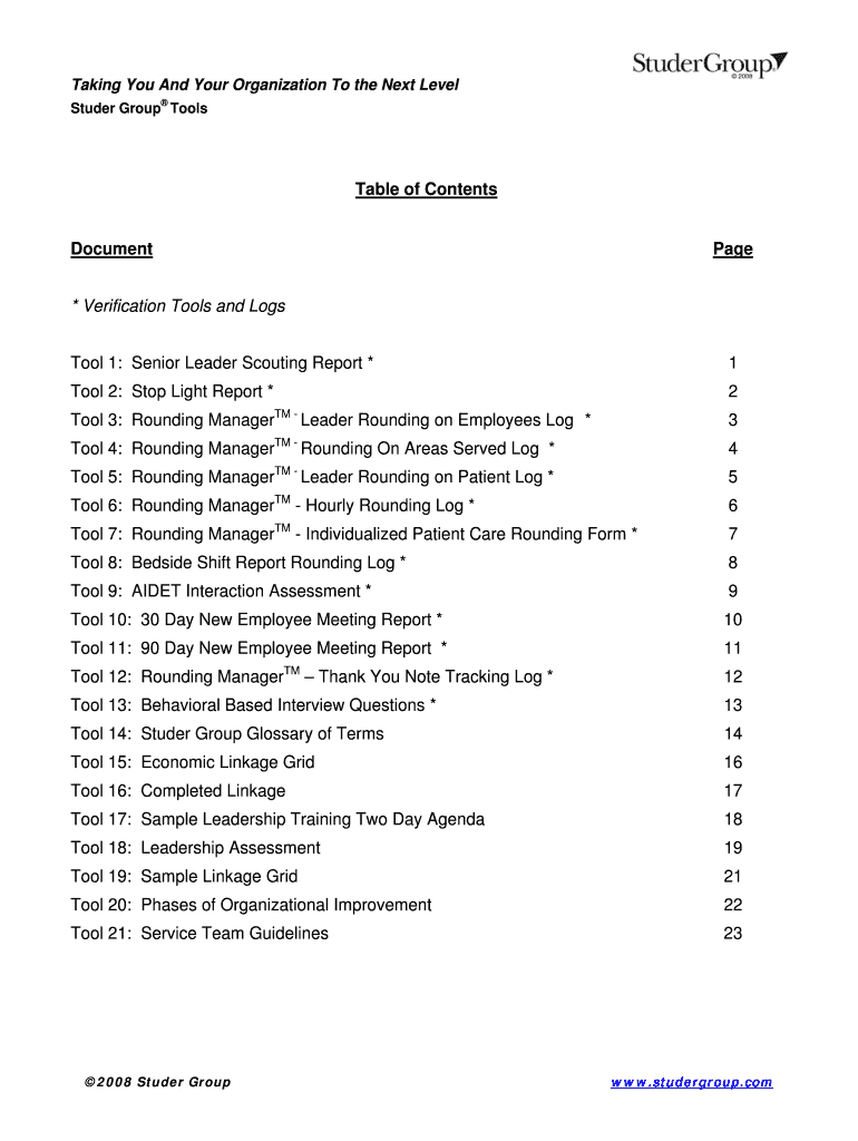 Taking You And Your Organization To the Next Level Stud her Group Tools Table of Contents Document Page * Verification Tools and Logs Tool 1: Senior Leader Scouting Report * 1 Tool 2: Stop Light Report