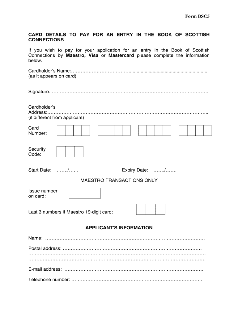 This form is used to collect card payment details for applying for an entry in the Book of Scottish Connections.