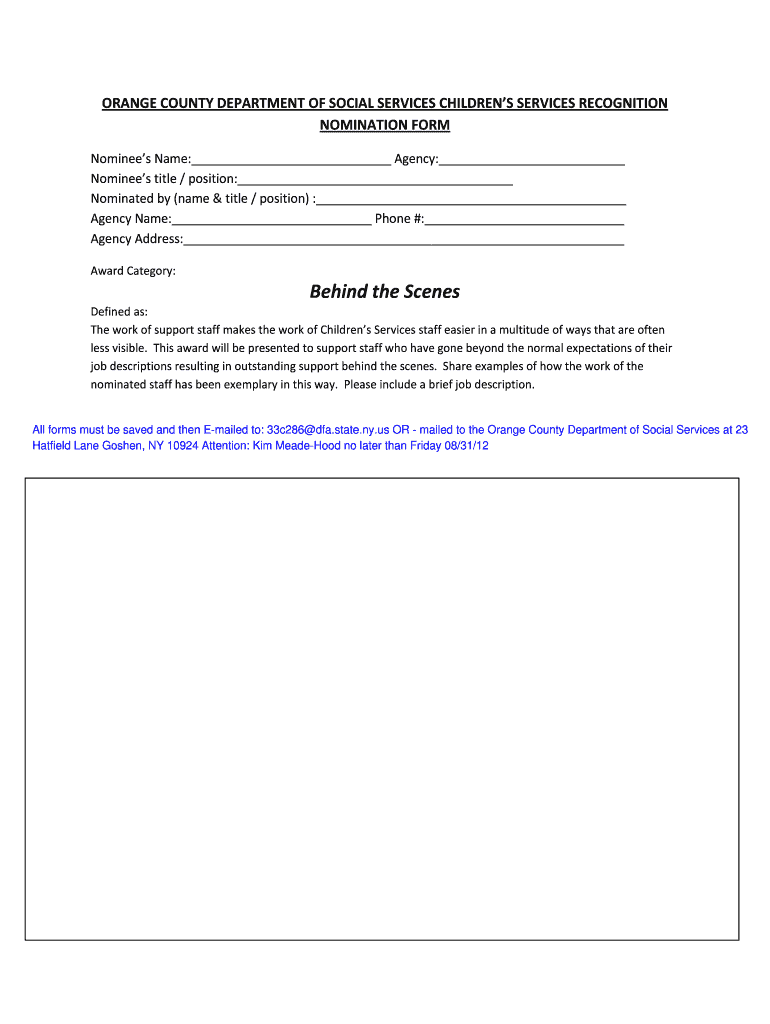 This document is used to nominate individuals for recognition in the Children's Services department for their exceptional behind-the-scenes work.