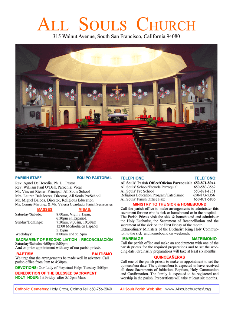 A PARISH STAFF S MASSES Sunday×Domingo: Weekdays: ARCH 315 Walnut Avenue, South San Francisco, California 94080 EQUIP PASTORAL Rev. Angel De Heredia, Ph.D., Pastor Rev. William Paul Odell, Parochial