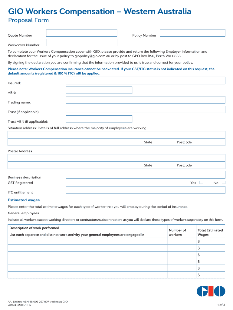 Get the free GIO Workers Compensation Western Australia Proposal Form Quote Number Policy Number ...